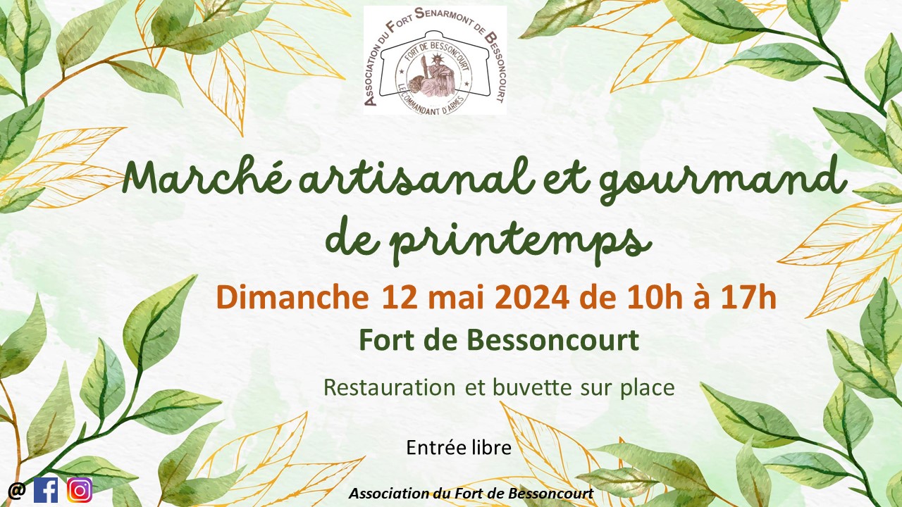 Marché artisanal et gourmand de printemps – Fort de Bessoncourt Date 12 Mai 2024 Expiré ! Heure 10h00 - 17h00 Catégorie Animation Marché Organisateur Association du Fort Sénarmont de Bessoncourt Téléphone 06 13 61 85 04 Email assoc.fort.bessoncourt@gmail.com Site Web https://www.fort-bessoncourt.fr Partagez cet événement